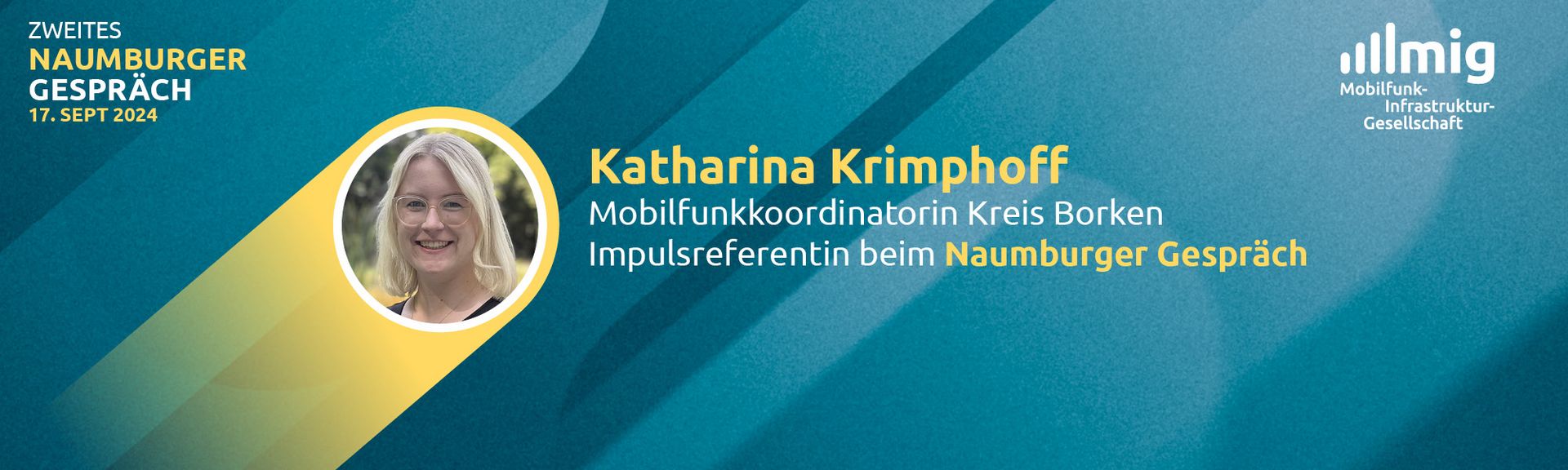 Eingeleitet wird das Podiumsgespräch durch ein Impulsreferat von Katharina Krimphoff. Sie ist seit 2013 Verwaltungsbeamtin im Landkreis Borken (NRW) und dort seit 2021 in der Stabsstelle, Fachabteilung Kreisentwicklung als Mobilfunkkoordinatorin für den Kreis Borken tätig. Sie spricht über die Relevanz der staatlichen Mobilfunkförderung für Kommunen und ihre Erfahrungen mit der MIG.