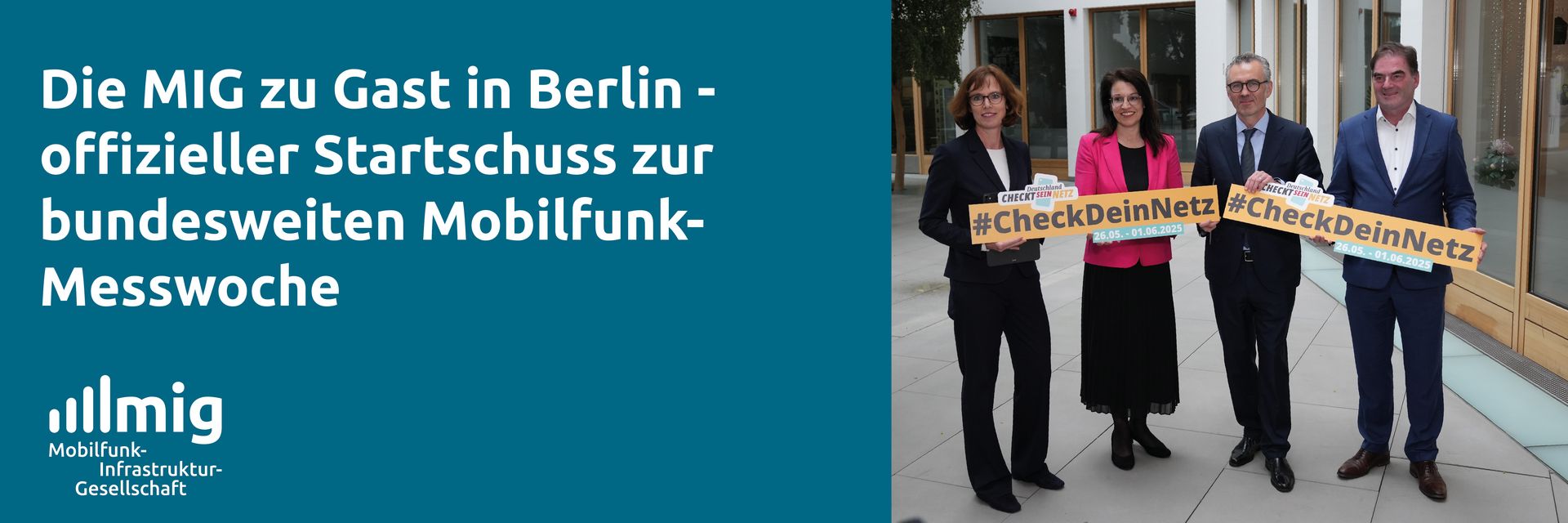 Vor dem Bundestag gaben heute Thomas Jarzombek, Parlamentarischer Staatssekretär beim Bundesminister für Digitales und Staatsmodernisierung, Martina Englhardt-Kopf, Parlamentarische Staatssekretärin beim Bundesminister für Landwirtschaft, Ernährung und Heimat, die Vizepräsidentin der Bundesnetzagentur (BnetzA) Dr. Daniela Brönstrup und Ernst Ferdinand Wilmsmann, Geschäftsführer der MIG, den offiziellen Startschuss zur ersten bundesweiten Mobilfunk-Messwoche, die am Montag, dem 26. Mai beginnt und am 1. Juni endet. Gemeinsam warben sie noch einmal vor den Pressevertretern für eine rege Teilnahme der Bevölkerung an der gemeinsamen Initiative von Bund, Ländern und Kommunen.