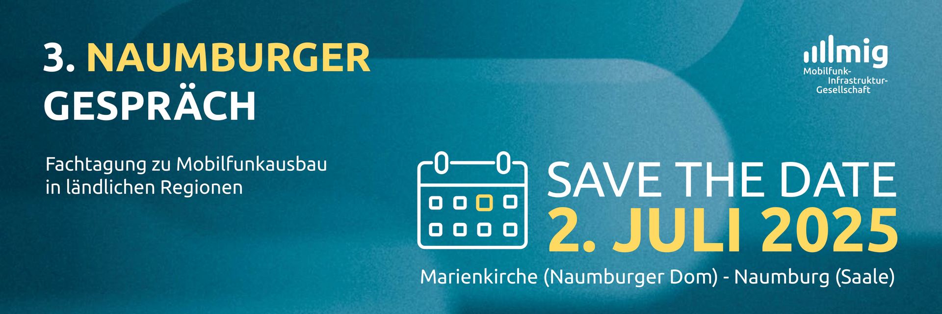 Am 2. Juli 2025 lädt die MIG wieder zu einer Fachtagung zum Mobilfunkausbau in ländlichen Regionen, dem 3. Naumburger Gespräch, in die Marienkirche am Naumburger Dom ein. Gemeinsam mit Expertinnen und Experten aus Politik, Unternehmen, Verbänden und Wissenschaft wollen wir aktuelle und wichtige Themen rund um den flächendeckenden Mobilfunkausbau insbesondere in ländlichen Gebieten diskutieren.