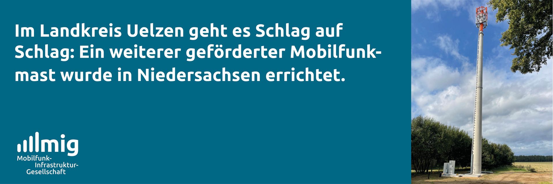 In der niedersächsischen Gemeinde Wriedel im Landkreis Uelzen wurde von der DFMG – Deutsche Funkturm GmbH ein weiterer durch Bundesmittel geförderter Mobilfunkmast errichtet. Es ist bereits der zweite Mobilfunkmast der MIG im Landkreis Uelzen. Dass die Masten innerhalb kürzester Zeit generalstabsmäßig gebaut werden konnten, liegt auch an der sehr guten Zusammenarbeit mit dem Landkreis Uelzen und seiner Mobilfunkkoordinatorin Sandra Suck.