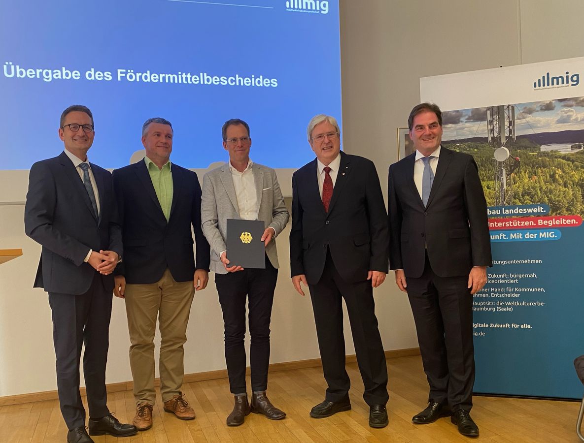 Der Minister für Wirtschaft, Arbeit und Energie des Landes Brandenburg Prof. Dr.-Ing. Jörg Steinbach überreichte am 30. Mai 2023 in Potsdam zusammen mit dem Staatssekretär im Bundesministerium für Digitales und Verkehr Stefan Schnorr und dem Geschäftsführer der Mobilfunkinfrastrukturgesellschaft mbH (MIG) Ernst Ferdinand Wilmsmann den im Land Brandenburg ersten Zuwendungsbescheid für einen aus Mitteln des Bundes geförderten Mobilfunkmast.
