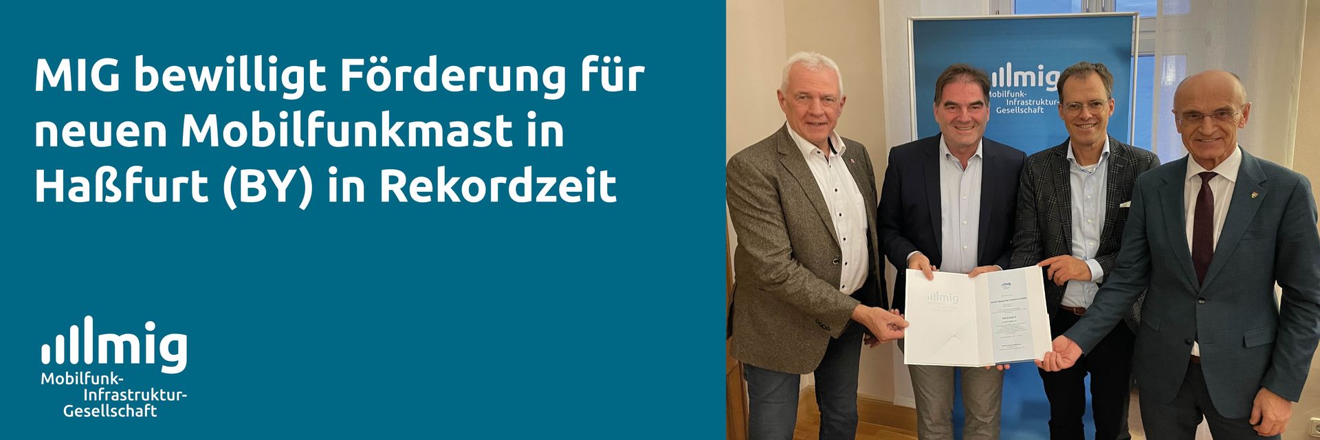 Naumburg (Saale), 14. November 2024 – In Haßfurt (Landkreis Haßberge) wird ein aus Bundesmitteln finanzierter Mobilfunkmast gebaut, der dort eine bisher noch unversorgte Fläche von über 4 km² und mehrere Haushalte versorgen wird. Den Förderbescheid dafür übergab der Geschäftsführer der Mobilfunkinfrastrukturgesellschaft (MIG), Ernst Ferdinand Wilmsmann, am 14. November 2024 vor Ort an die Deutsche Funkturm GmbH (DFMG), die den Zuschlag für den Bau des Masts erhalten hat. Die drei Netzbetreiber Telefónica, Telekom und Vodafone haben sich gegenüber der MIG bereits vertraglich dazu verpflichtet, den neuen Mast künftig mit ihren Antennen zu nutzen.