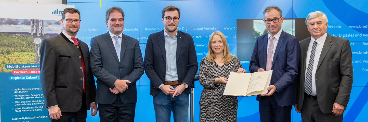 Naumburg (Saale), 26. Oktober 2022 – Die Parlamentarische Staatssekretärin im Bundesministerium für Digitalisierung und Verkehr, Daniela Kluckert, hat heute gemeinsam mit Ernst Ferdinand Wilmsmann, Geschäftsführer der Mobilfunkinfrastrukturgesellschaft mbH (MIG), in Berlin den ersten Fördermittelbescheid für den Bau eines Mobilfunkmasts übergeben. Dieser soll in Lambach im Landkreis Cham durch die Deutsche Funkturm GmbH (DFMG) errichtet werden.